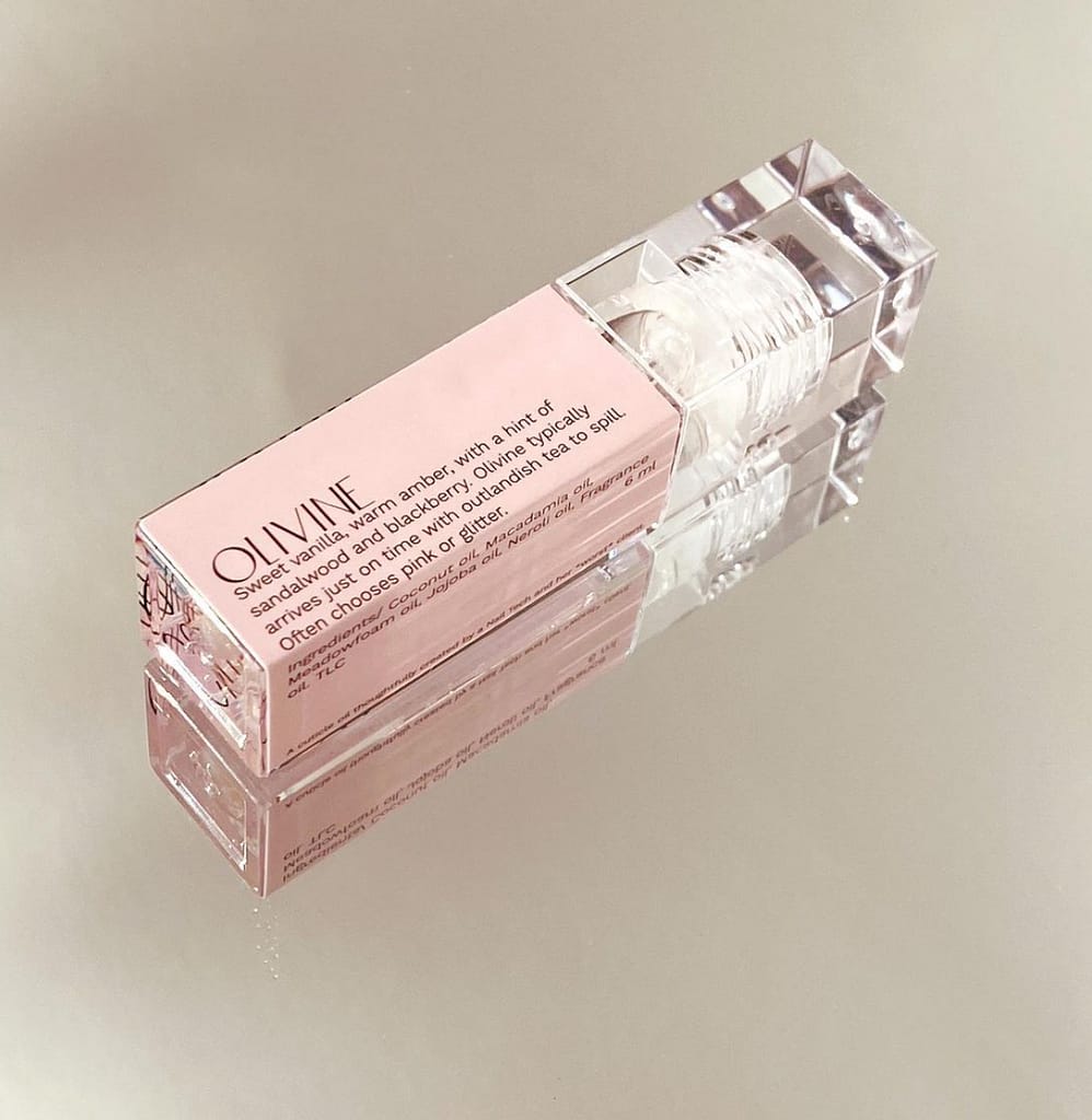 These scents were created after “client personas” in which Mia has a standing two-week appointment that never gets moved or cancelled. Can be very indecisive over the 5 neutrals in her rotation (including red, the other neutral). And Olivine typically arrives just in time with outlandish tea to spill. Often chooses pink or glitter.