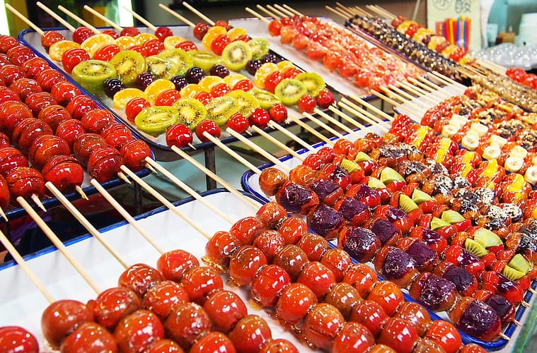 For dessert, how about an easy treat originating in China. Tanghulu is a tasty candied fruit dessert made by skewering berries or other small fruit pieces, and coating it with a crunchy sugar glaze. Traditionally made with mountain hawthornes, or Chinese hawberries, it’s most commonly seen on TikTok with strawberries, grapes, or pineapple.
