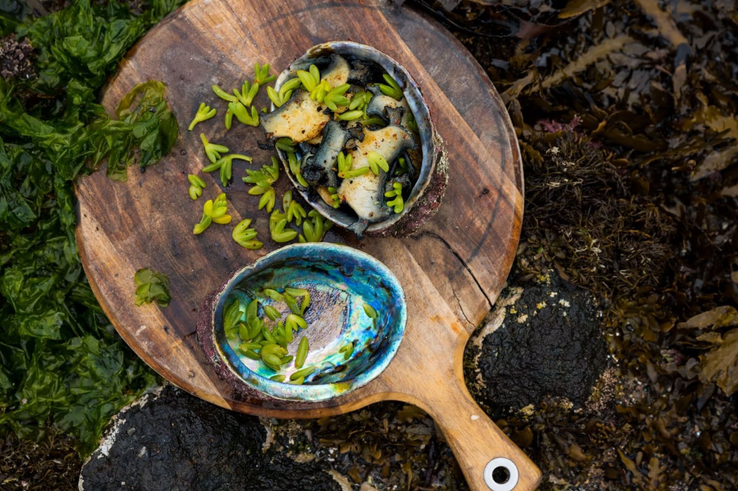 “The water was so extremely clear; the waters that surround the Chatham Islands are cold, and the islands are formed mostly on basalt. I saw a small kina (sea urchin native to New Zealand) bed and went down to bring up a couple to inspect. I cracked one open with my knife and slid one of the sweet fat tongues out with my thumb and into my mouth. I had to pause for a moment to take everything in. Food epiphanies don’t come along that often, but it was here in this bay at the edge of the world that everything made sense.” – Tom Hishon