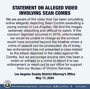 Update: Diddy and Cassie search terms are resurfacing following this hotel lobby video going public online. The pair dated for approximately a decade when they started dating back in 2007. Apparently, Los Angeles County prosecutors have claimed that there are no charges are forthcoming regarding Diddy’s disturbing actions shown in the viral 2016 video. Here is the official statement released on social media detailing why: