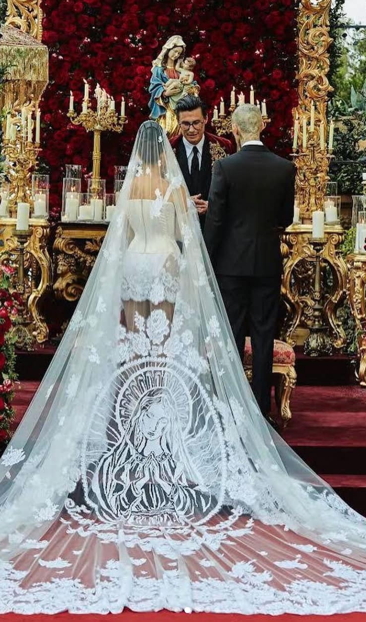 The three words are tattooed on Travis’ hairline and Kourt and Dolce and Gabbana wanted something special made in the veil.