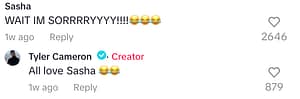 One TikTok user, believed to be the woman in the story, took to the comment section to apologize to Cameron, who responded with “All love Sasha.”