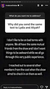 Uche didn’t really address why he sent the same text to Lydia and Aaliyah following the show but he did say that he doesn’t like “to be on bad terms with anyone.”