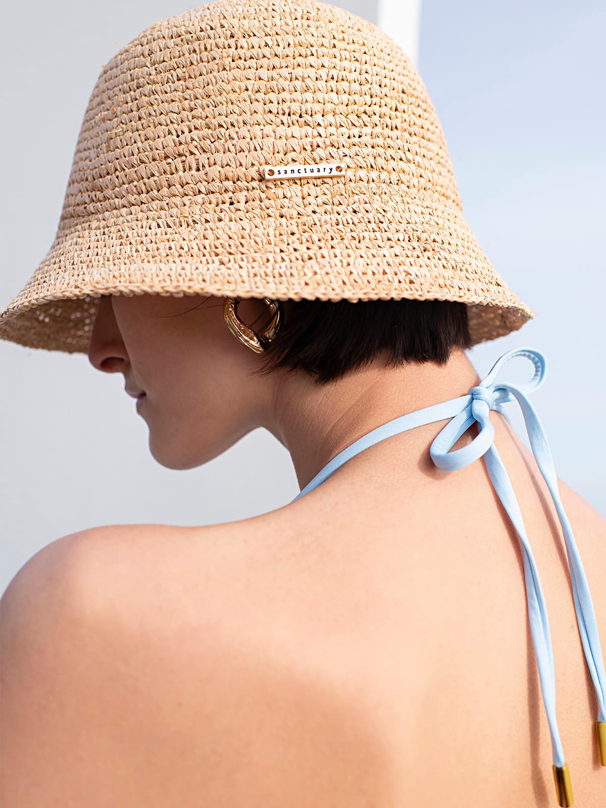 A must-have accessory for the fashion-forward traveler. Crafted from straw crochet material, this woven bucket hat embodies the trend of the season. With its unique blend of practicality and style, the Cloche Hat offers protection from the harsh rays of the sun while effortlessly adding a chic touch to your vacation ensembles. Whether you’re strolling along the beach or exploring local markets, this versatile hat is the perfect companion. Embrace a sophisticated and sun-safe look with the Cloche Hat by Sanctuary, the ultimate accessory for fashion-conscious globetrotters.