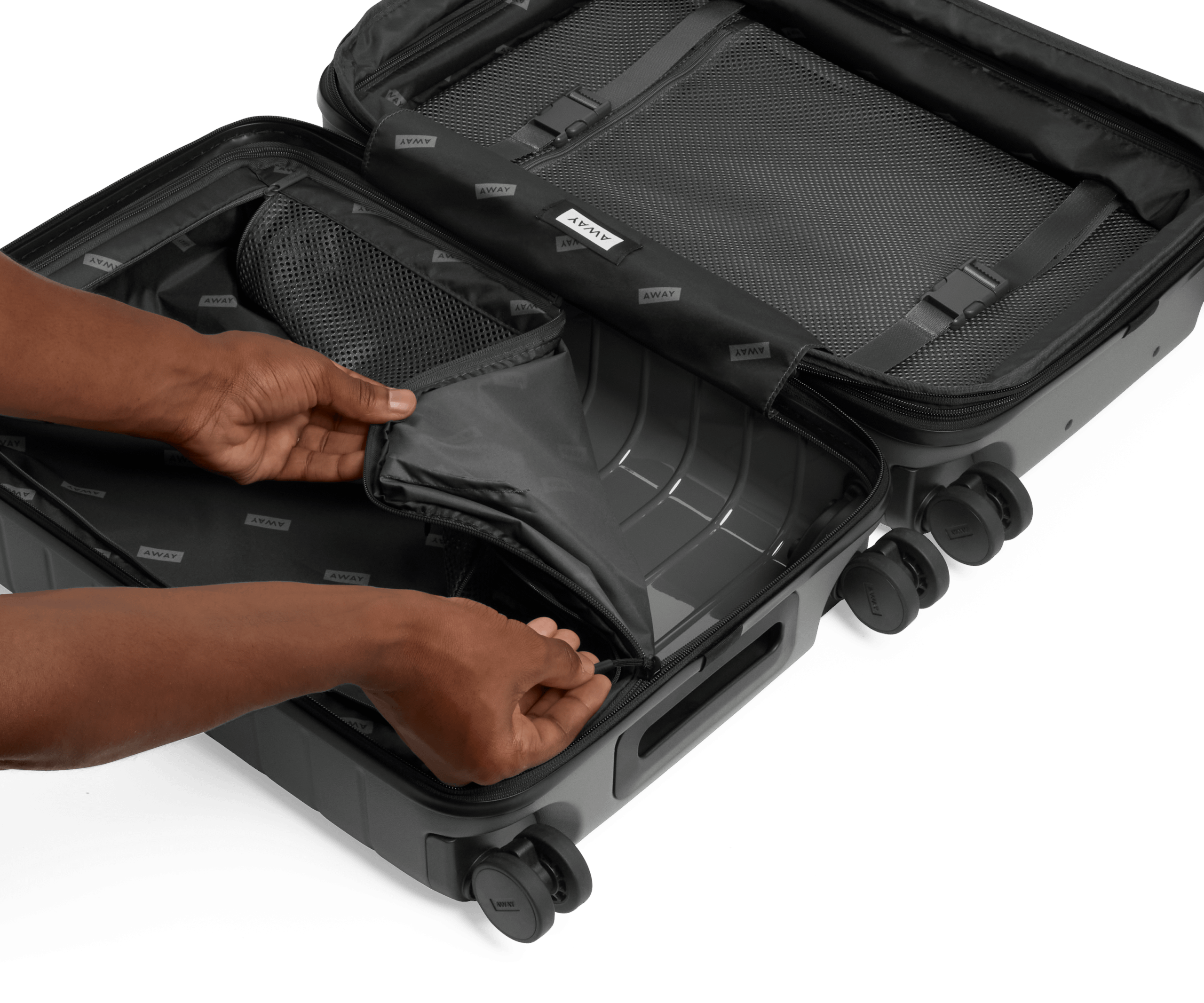 And finally, the pièce de résistance—an essential companion to house all of your carefully curated travel items. Introducing the Carry-On Flex suitcase by Away. Designed with versatility in mind, this suitcase effortlessly adapts to your needs. Unveiling its remarkable flexibility, the Carry-On Flex showcases a unique feature that allows you to unzip and expand its capacity by an additional 2.25″ (6 cm). So whether you find yourself extending your stay or acquiring delightful souvenirs along the way, this ingenious design ensures you never have to compromise on packing space. Crafted with durability and lightness in mind, this suitcase boasts 360° spinner wheels for effortless maneuverability and interior organization to keep your belongings neatly in place.