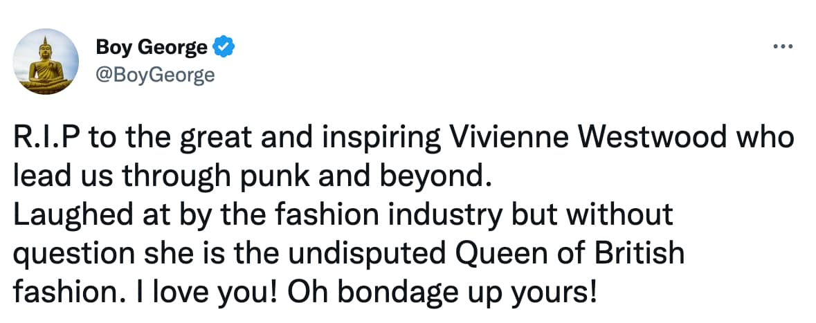 “R.I.P. to the great and inspiring Vivienne Westwood who led us through punk and beyond.” Carrying on with “Laughed at by the fashion industry with no question she is the undisputed Queen of British fashion. I love you! Oh bondage up yours!”
