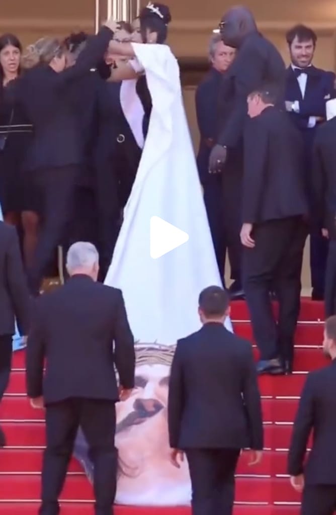 As you can see in the clip, Taveras is being ushered up the stairs of the Cannes Film Festival by security- but she is trying to show off the train of her gown in the process. Taveras is visibly frustrated as she is being repeatedly guided up the stairs by security even though she is hoping to show the audience and paparazzi her dress. She seemingly becomes increasingly annoyed as she attempts to show off the embellished train while security continues to guide her up the steps, surrounding her with their arms. Taveras even throws her hands up at one point to seemingly signal to them to back away.