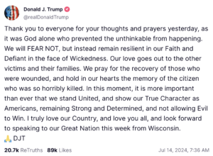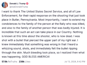 Following the shooting, Trump took to Truth Social to thank the US Secret Service for their “rapid response” extending his condolences to those killed and injured during the shooting. He also detailed how he was shot in the “upper part” of his “right ear.”
