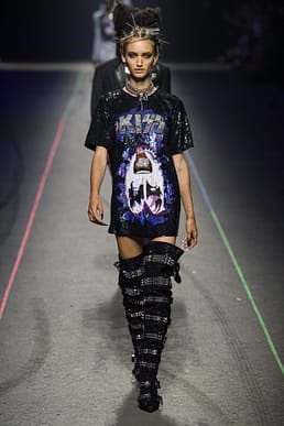 Band t-shirts on the runway are nothing new and last summer The Grateful Dead was an inevitable part of the tie-dye craze (Notably at R13). This season, Philipp Plein teamed up with Kiss for a series of glam rock looks: A bodysuit and a cut-out dress emblazoned in sequins, and t-shirts, for example. One t-shirt, on the female model, was oversized- glistening and styled with chunky chain necklace- and another, on the male, was a version of the ‘Destroyer’ tee but with Phillip Plein branding added to the bottom. The designer is at the epitome of ostentatious luxury, making the band t-shirt presented in this way kind of fitting. It’s all about show.