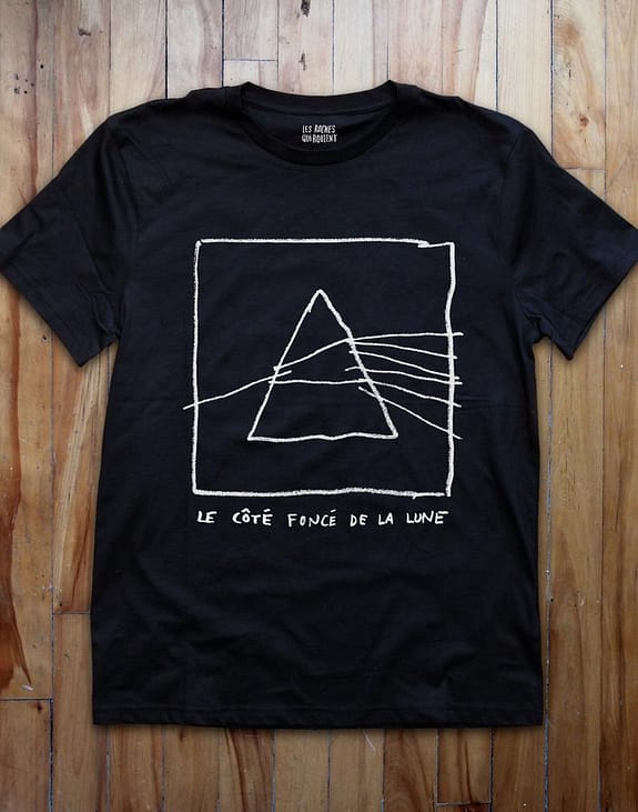 In a more DIY take, independent Montreal-based brand Les Roches Qui Roulent print hand illustrated versions of album covers onto t-shirts while translating the names into French. Examples include ‘Le côté foncé de la lune’ (black with white squiggly lines like a rough doodle in a school textbook) and ‘têtes parlentes,’ (the members of Talking Heads made up of squares reinterpreted as a child-like sketch in red outline). It highlights the lightheartedly aesthetic and lacking in seriousness that seems attached to the wearing of t-shirts now while also rekindling the insider status band t-shirts should hold.