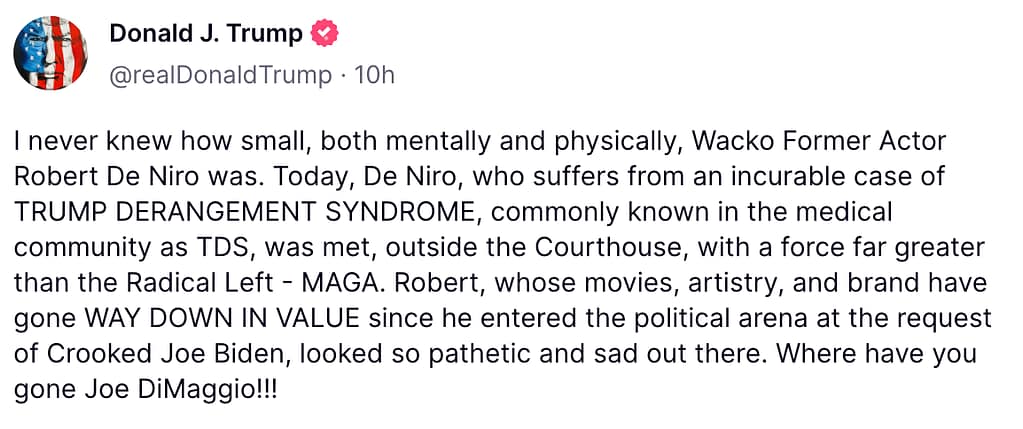 Following a verbal altercation with Trump supporters in which Robert De Niro called them “gangsters” outside of the Manhattan court room where the Trump trial is taking place, Trump is firing back on Truth Social with a new post directed at the actor (here).