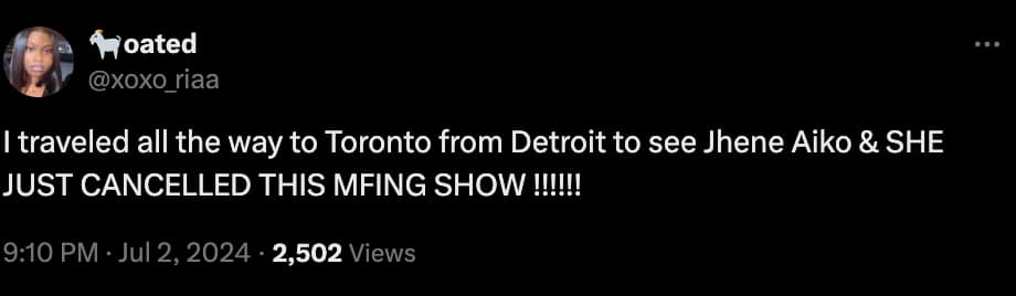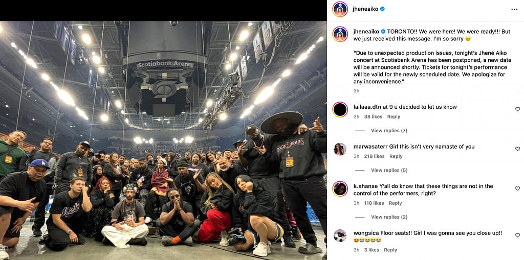 According to this TikTok video posted by user @tandon_rebecca, Jhene Aiko’s Toronto tour stop has been canceled at the last minute and postponed to a later date (not yet announced) following the news.