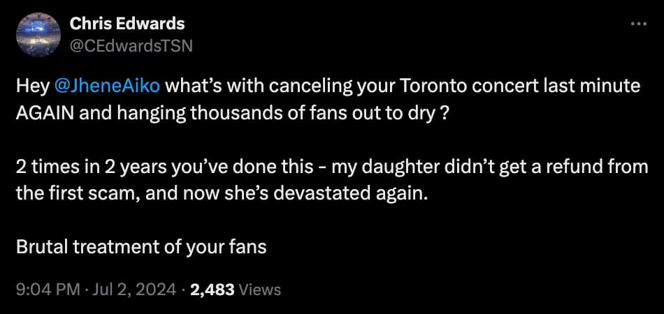 Scotiabank Arena, the venue where Aiko was set to perform, tweeted the news on X as shown below: