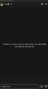 After that Nina also posted some stories on her Instagram in which she shared a selfie and in the next story she wrote – “I’m OK but it’s going to be a long road of recovery ahead. It’s safe to say that my first time on a dirt bike will also be my last. Lol.”
