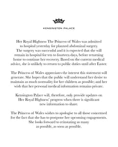 “The Princess of Wales appreciates the interest this statement will generate. She hopes that the public will understand her desire to maintain as much normality for her children as possible; and her wish that her personal medical information remains private. Kensington Palace will, therefore, only provide updates on Her Royal Highness’ progress when there is significant new information to share” (also noted here).