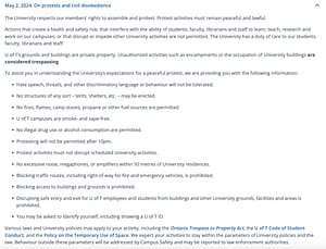 “The university respects the rights of members of our community to assemble and protest within the limits of the law and U of T policies, but they must not interfere with the ability of students, faculty, librarians and staff to learn, teach, research and work on our campuses, or disrupt or impede other university activities. Our preference is to start with dialogue. Those who contravene university policy or the law risk the consequences set out in various laws and policies such as the code of student conduct, which could include suspension.”