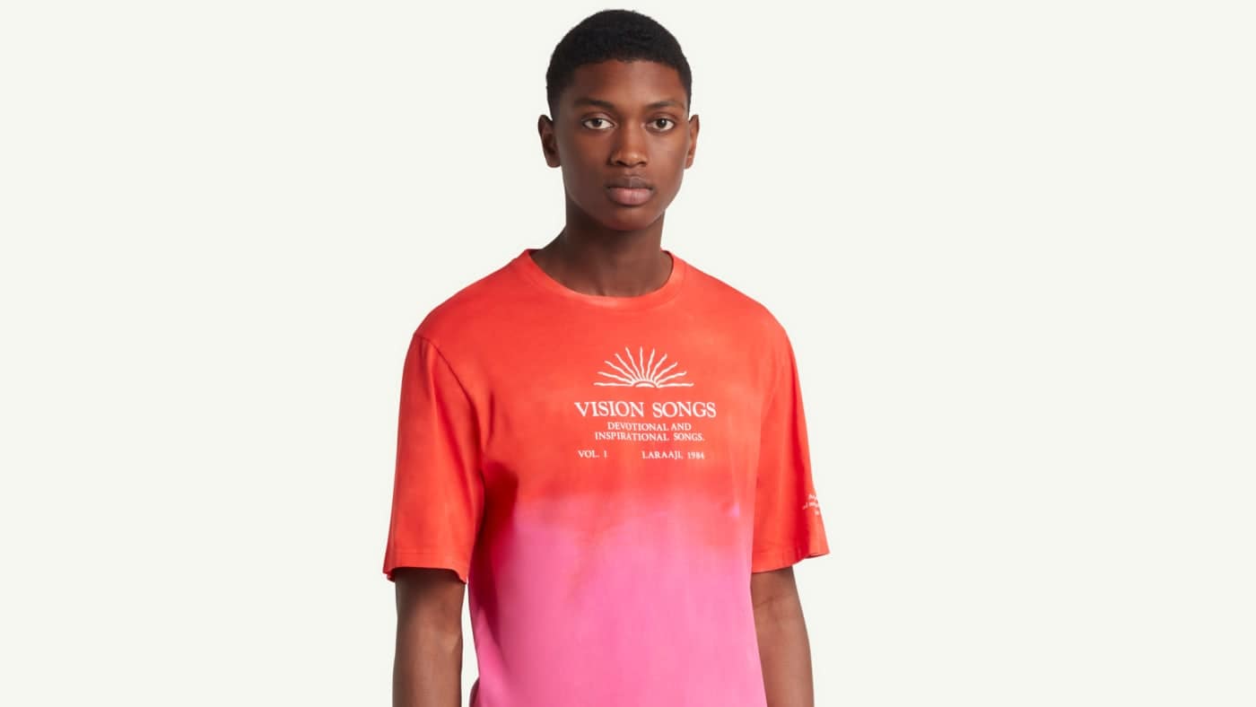 Wales Bonner’s latest collection debuted this week, a capsule that channels inspiration from celestial musician Laraaji who famously collaborated with Brian Eno on the album Ambient 3: Day of Radiance. This collection, though, draws more from Laraaji’s album Vision Songs Vol. 1 from 1984, hence the collection’s name “Vision Songs.” The London-based brand released a limited-run series of pure cotton jersey t-shirts, dyed by hand in soft reds, pinks, and oranges, with all proceeds going to the Care India Foundation.