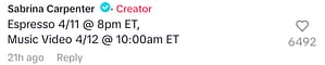 Looks like we can expect to hear Espresso at 8 PM EST when it drops tonight, and the corresponding music video will be arriving tomorrow (April 12) at 10 AM EST.