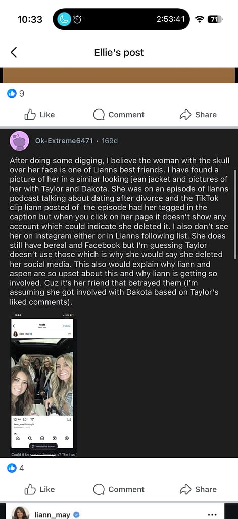 Another layer emerged when viewers noticed that Liann and Aspen, Taylors mom and sister, were visibly upset in their own posts and comments. Reddit users pointed out that if the alleged “other woman” was part of Liann’s friend group, that would explain why they seemed emotionally involved.
