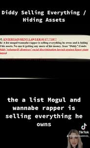 As noted in the TikTok video, a new blind item claim alleges that Diddy is selling everything he owns and he is hiding all of his assets “No one is getting any more of his money,” claims the blind item.