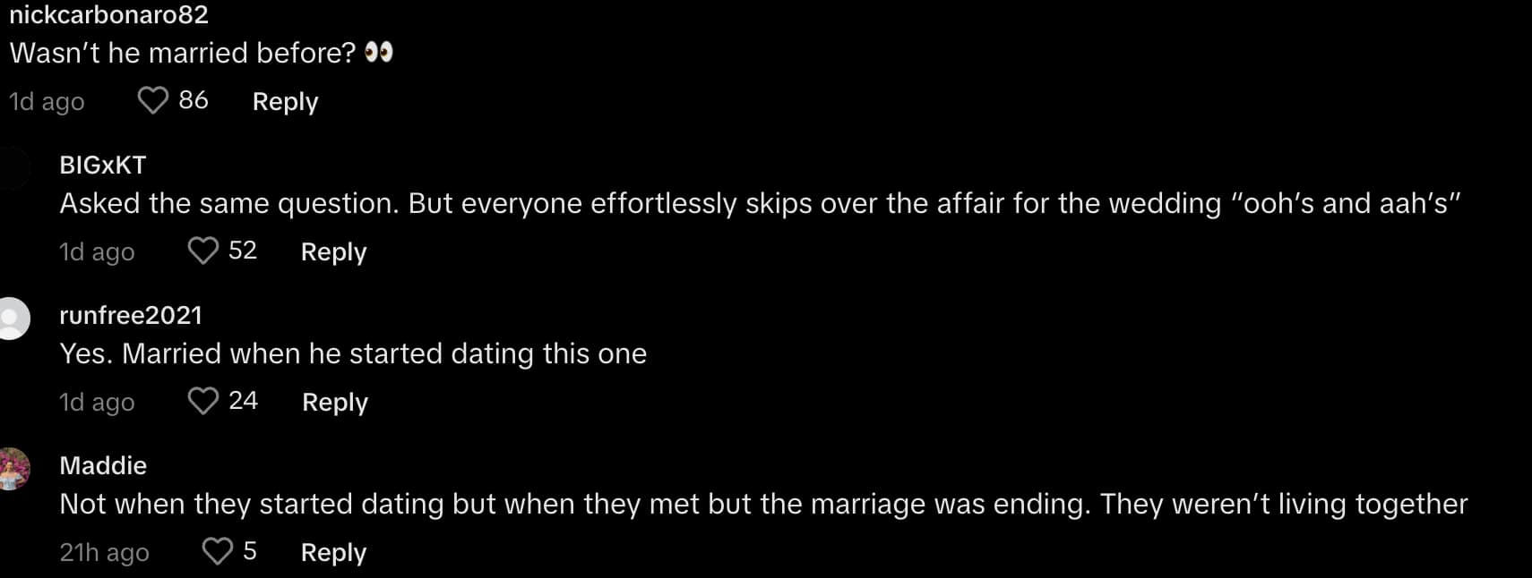However, other claims in the comment section of the TikTok video allege that his marriage to Axster was ending when he got together with Harrison in real life.